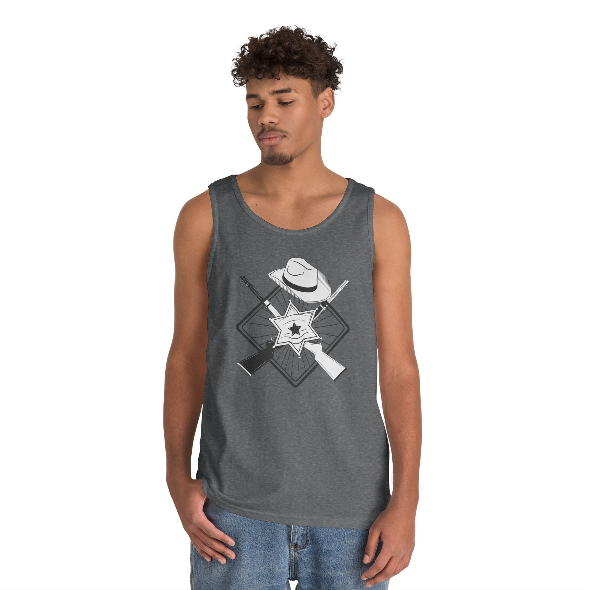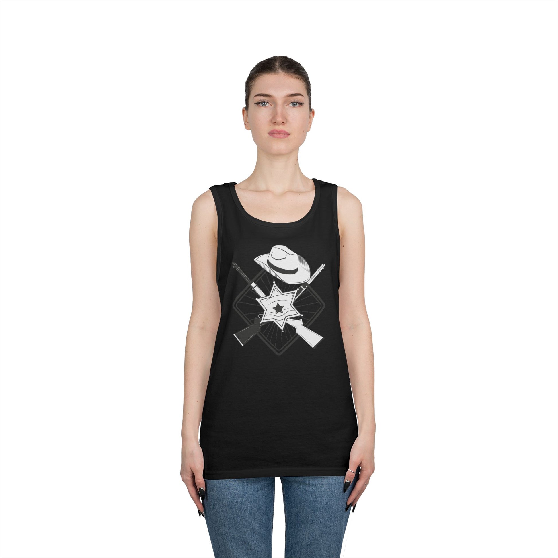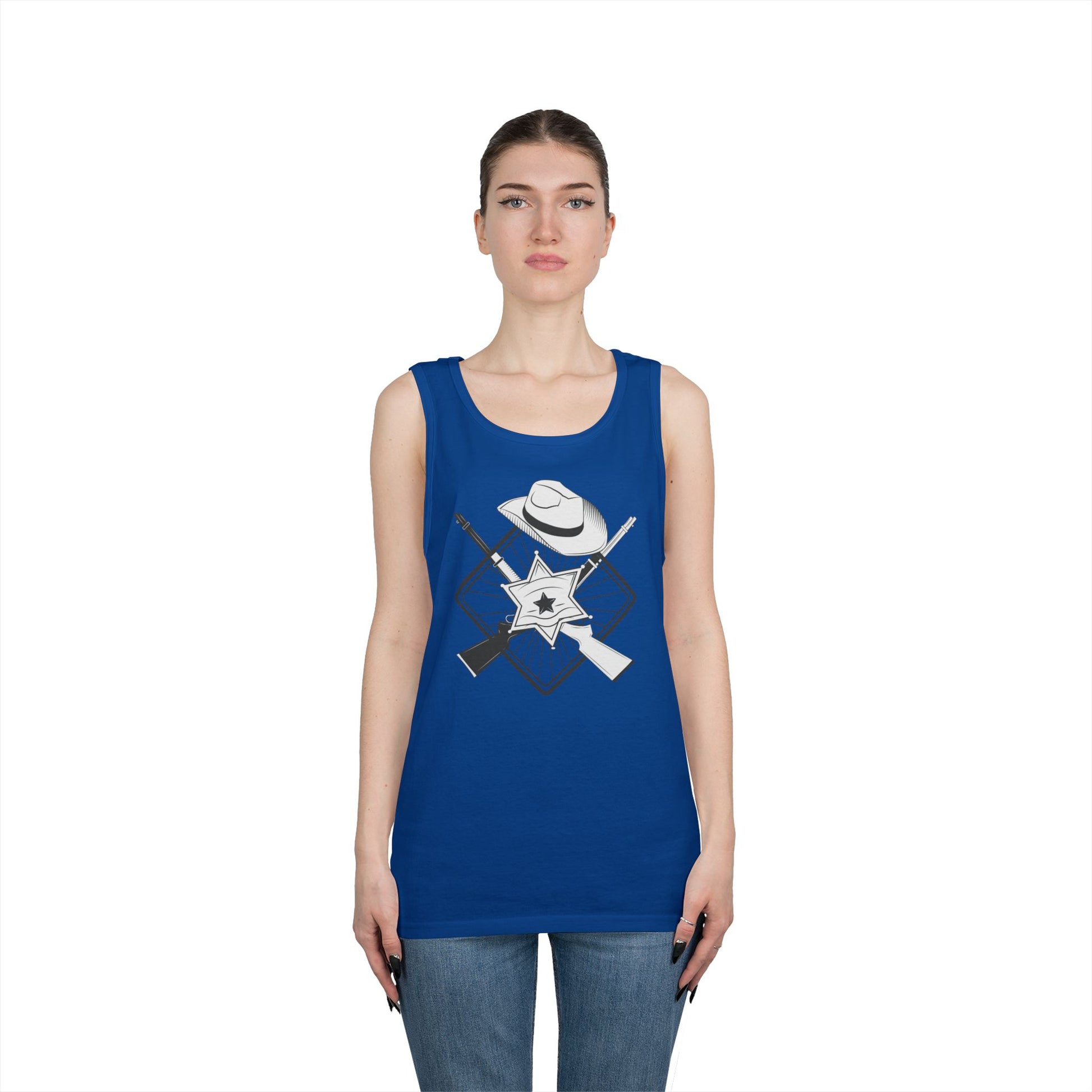 Embrace a casual and stylish vibe with this Unisex Heavy Cotton Tank Top. Perfect for warm weather, this tank top adds an effortless touch to your wardrobe. Whether you're lounging at home, hitting the beach, or enjoying a summer barbecue, this tank is designed for comfort and versatility. It’s ideal for anyone looking to showcase their casual style while providing comfort throughout the day. Great for outdoor gatherings, vacations, or as a staple piece for your summer wardrobe. Perfect for birthdays, casual celebrations, and even thematic parties like Wild West gatherings!